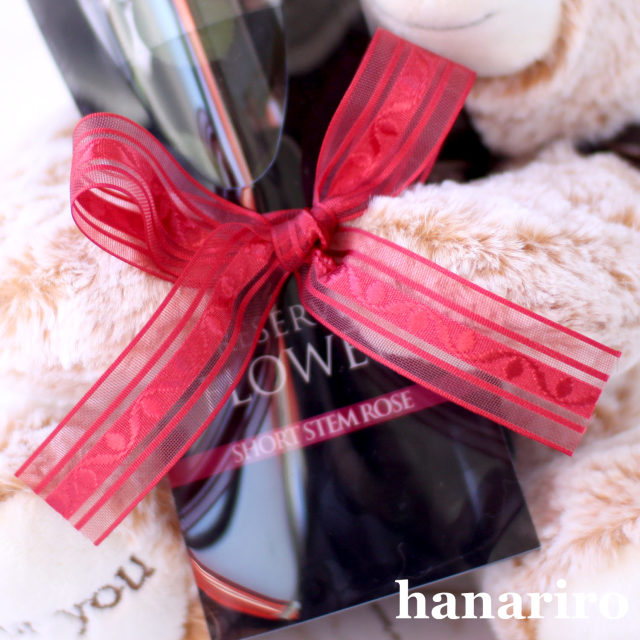 ご紹介するフラワーギフトはサンタの帽子を被ったモコモコした手触りも気持ちいい可愛らしいクマさんのぬいぐるみと一輪のピンクの薔薇をセットにしたフラワーギフトです。