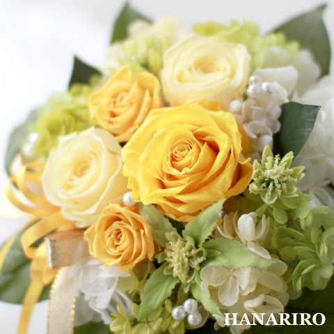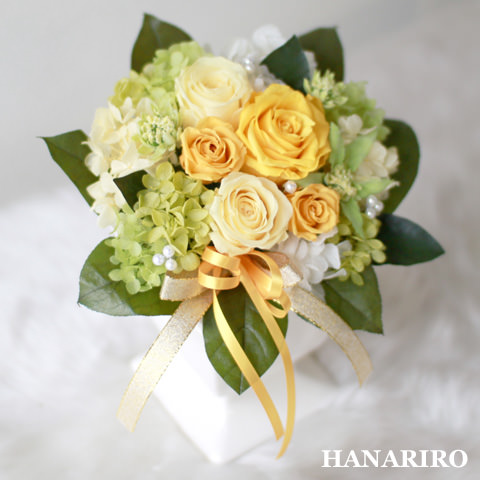 黄色系のお花を使用して、見ていると気持ちが晴れやかに元気になれる、そんなイメージでお作りしたプリザーブドフラワーギフトです。 |