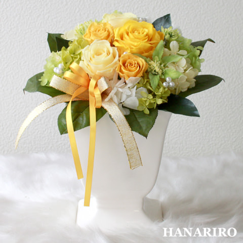 ご紹介するフラワーギフトは黄色系のお花を使用して、見ていると気持ちが晴れやかに元気になれる、そんなイメージでお作りしたプリザーブドフラワーギフトです。