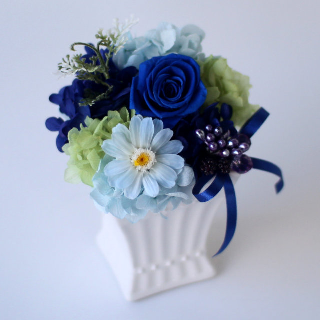 可愛らしいブルー系のお手頃サイズのプリザーブドフラワーギフトです。 |
