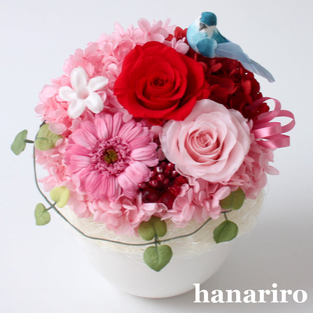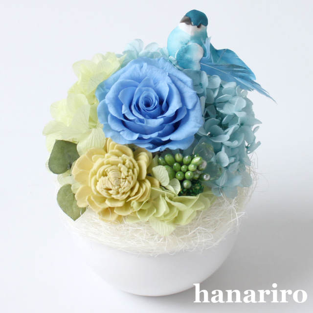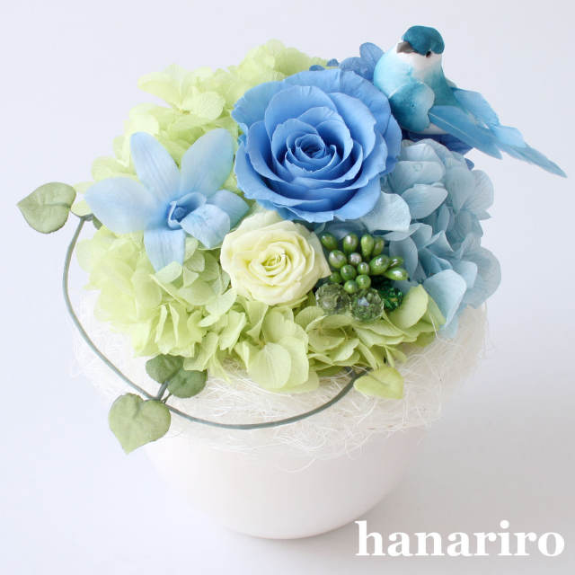 高齢の母へのプレゼントとして購入しました。たいへん喜んでくれたので満足しています。花の色合いがとても良く、大きさもほど良い。幸福の青い鳥が花の横に留まっている姿がとても可愛らしい。造花みたいな偽物っぽさがなく、ほとんど生花に近い見た目です。プリザーブドフラワーが一つあるだけで部屋が明るくなります。母はたいへん気に入っています。クリアケースに入れるかどうかは好みだと思いますが、長い期間飾ることを考えると、ケースに入れたほうが埃がつかず良いと思いました。
